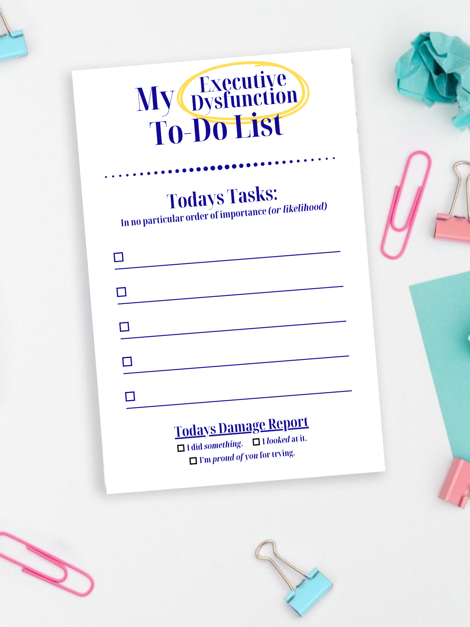 Meet the notepad for people who live somewhere between high-functioning and please don’t ask me to open another email. This Executive Dysfunction To-Do List is built for real life, the kind where tasks get written down in no particular order, progress is questionable, and victory sometimes means “I looked at it.”